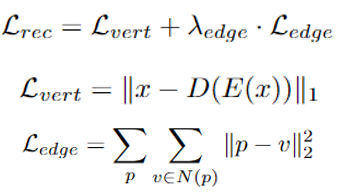 x是输入网格,Lvert和Ledge分别从顶点和边的层面对重建的网格进行几何约束,以实现精确的几何重建。