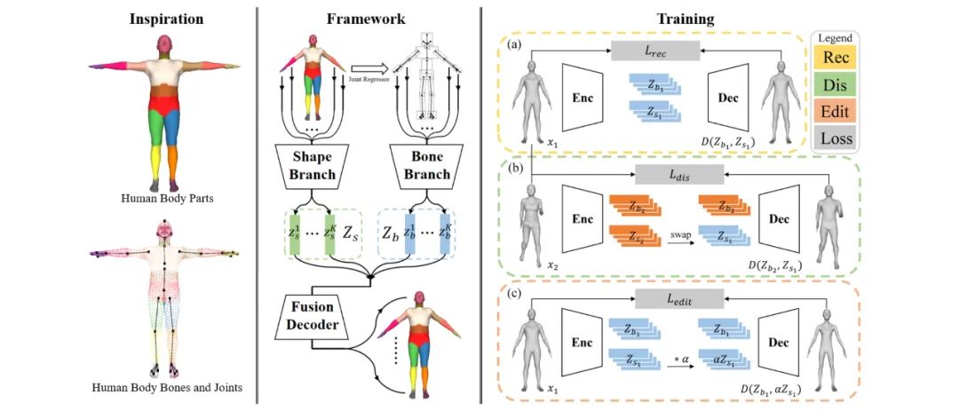 这种全新的基于人体局部的解耦策略不仅可以为表示提供了细粒度的语义,以实现部件级别的灵活可控编辑,还可以准确且高效地刻画几何结构,并且有利于无监督损失的构建,从而摆脱对配对监督数据的依赖。