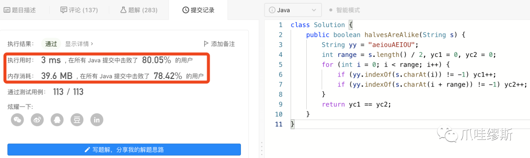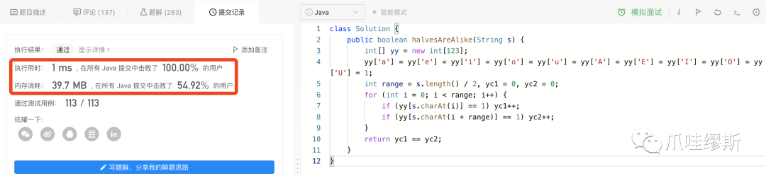 10个元音字符保存到数组yy【步骤2】获取前一半a和后一半b的长度range,即:range=s.length()/2; 【步骤3】同时遍历a和b,a的遍历下标是i,b 的遍历下标是i+range;如果发现a中存在元音字符,则yc1加1;如果发现b中存在元音字符,则yc2加1; 【步骤4】遍历完毕后,如果yc1等于yc2,则返回true;否则返回false;