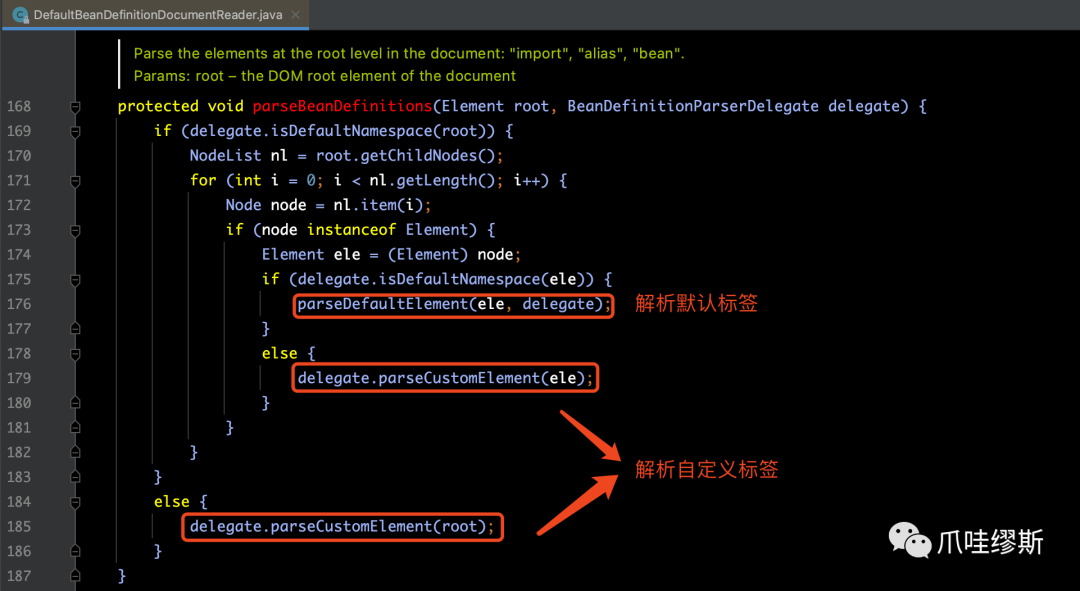 ",则表示是默认表空间,否则是自定义表空间)来判断,是进行默认标签解析还是自定义标签解析。相关源码如下所示: