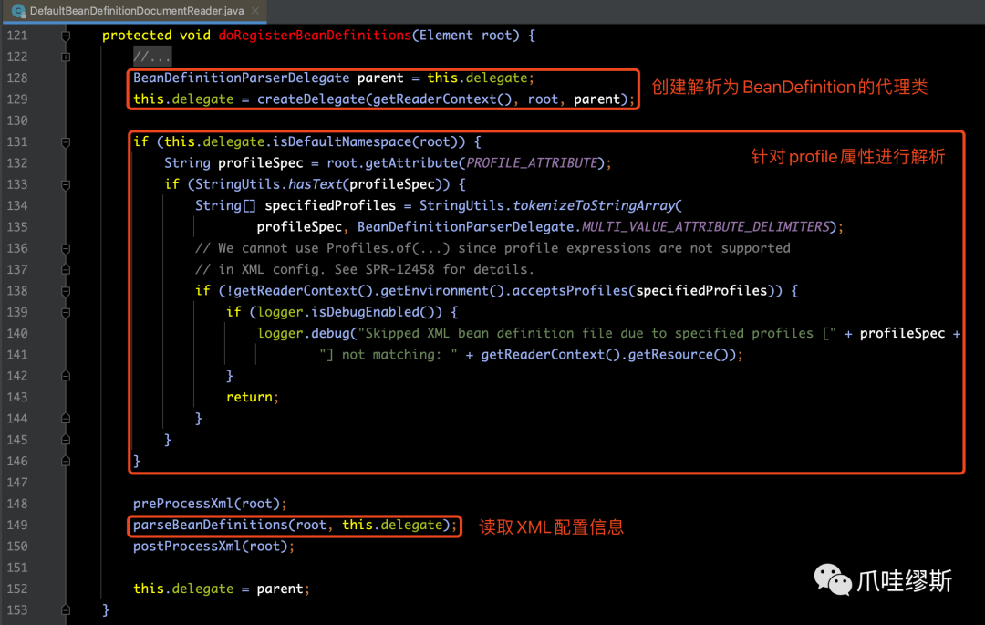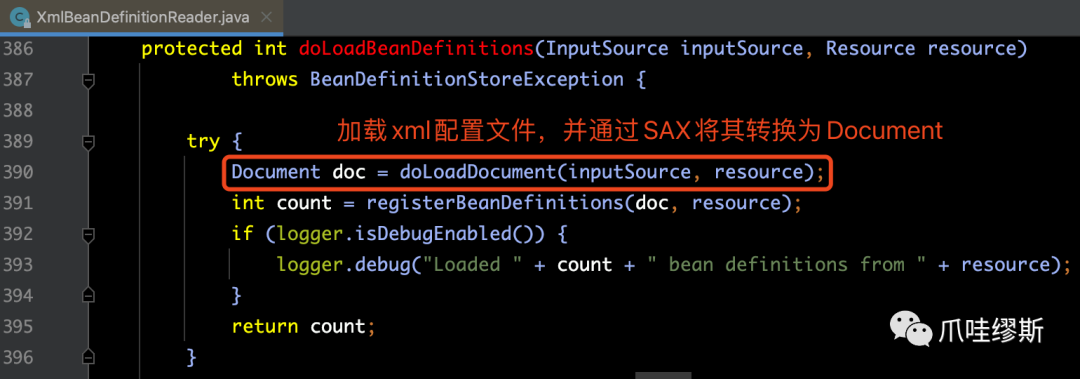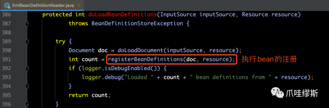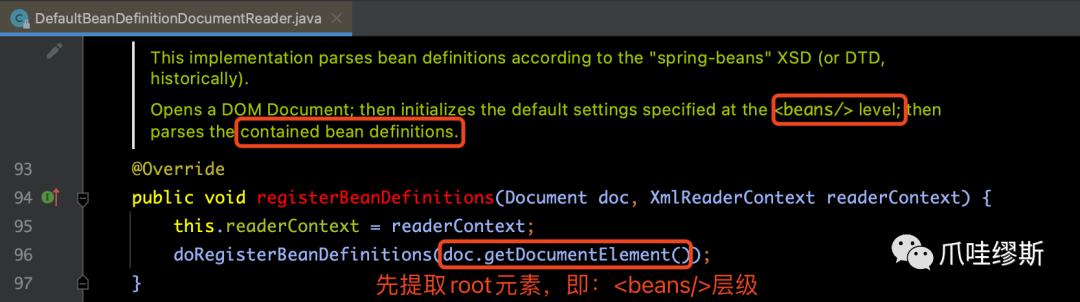 了。那么下面,我们就要操作这个Document实例对象doc进行bean的注册操作了。在介绍具体操作细节之前,我们先看一下相关源码部分: