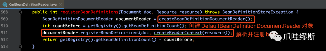 实例之后,我们再继续看documentReader.registerBeanDefinitions(...)