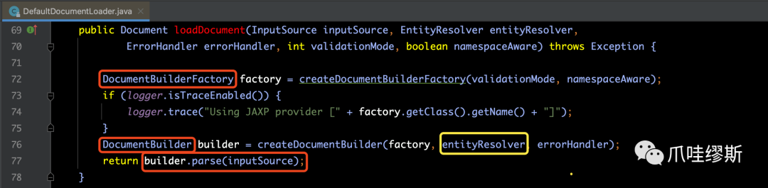 方法是通过SAX解析XML文档,这段代码是套路性的代码,没什么好说的。就是创建DocumentBuilderFactory——>创建DocumentBuilder——>调用parse(inputSource)方法解析inputSource实例然后返回Document对象。