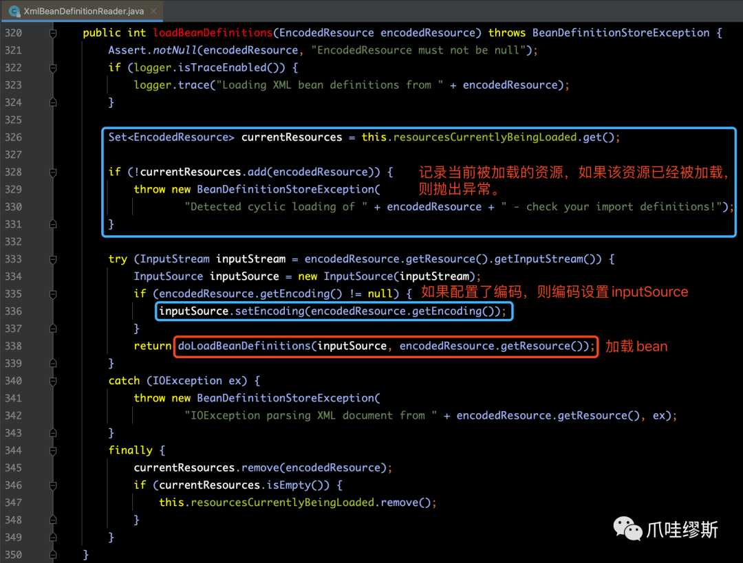 本方法就是针对EncodedResource实例对象进行bean的加载。具体执行如下3个步骤: