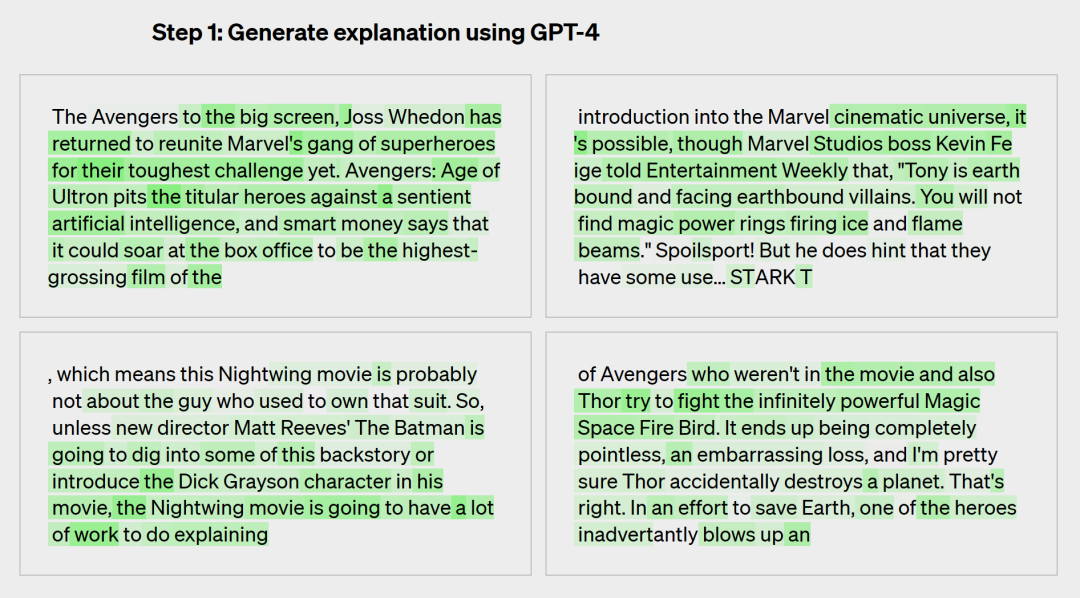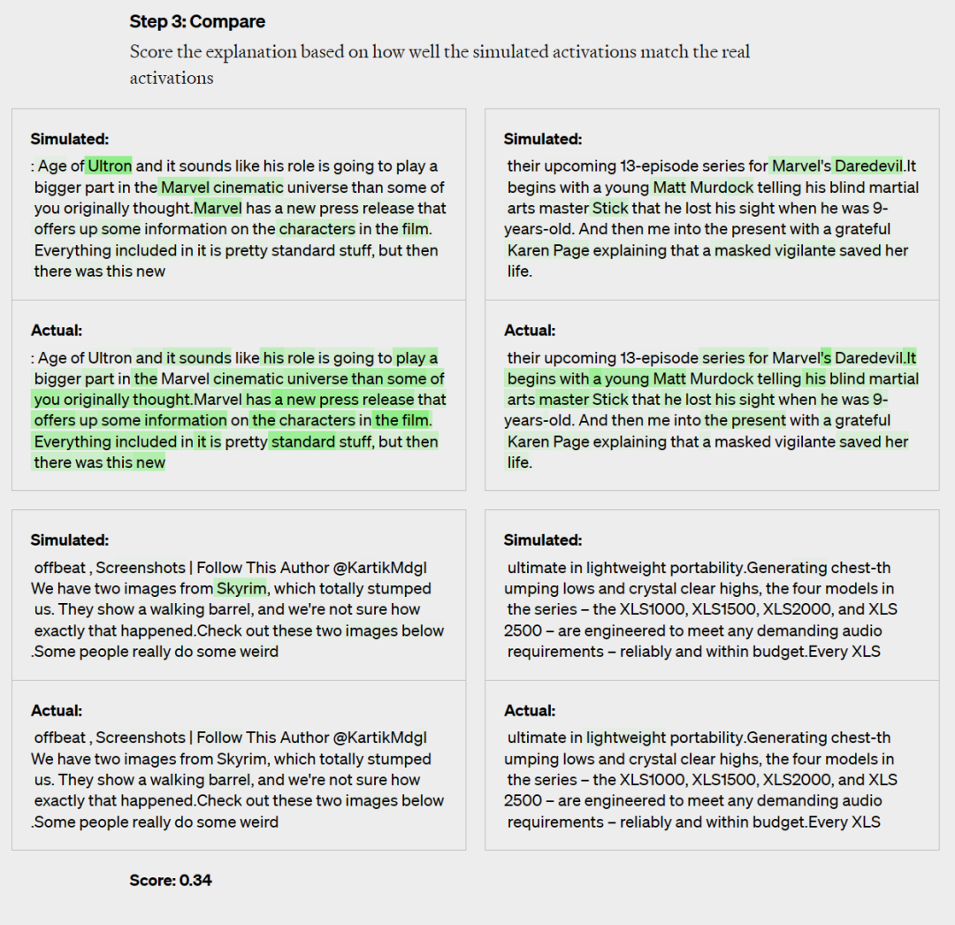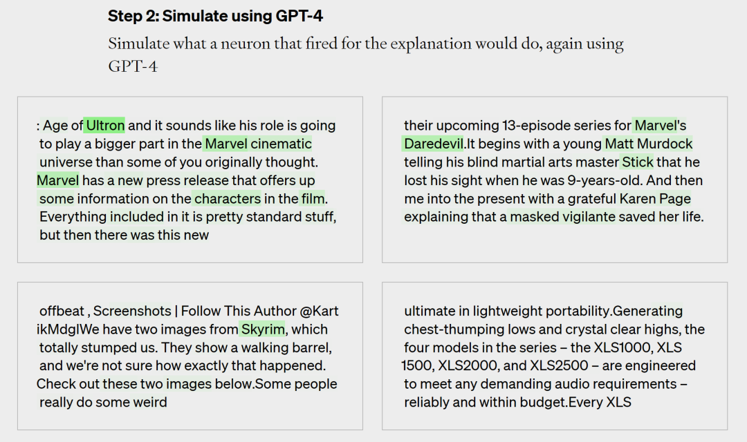 1.给GPT-4一个GPT-2已有的神经元,由GPT-4展示相关的文本序列和激活情况,产生一个对此类行为的解释;