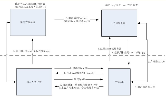 UID:一般为第三方系统帐号体系中的用户标识。第三方服务端一般需要保存UID和ClientID的映射关系,进行消息推送时,通过UID查找到相应的ClientID,便可进行定向推送了。