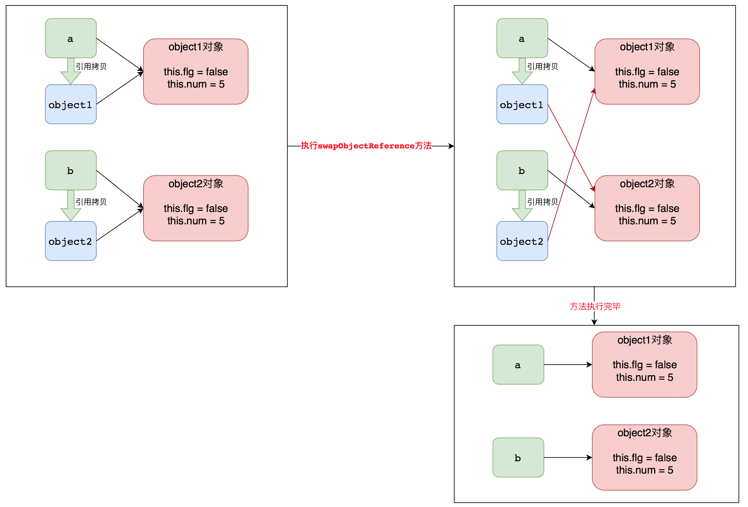 a : ParamObject{flg=true, num=1} b : ParamObject{flg=false, num=2}有了上面的知识之后,我们会发现这个方法中的引用地址交换,只不过是一个把戏而已,只是对方法中的两个局部变量的对象引用值进行了交换,不会对原变量引用产生任何影响的。