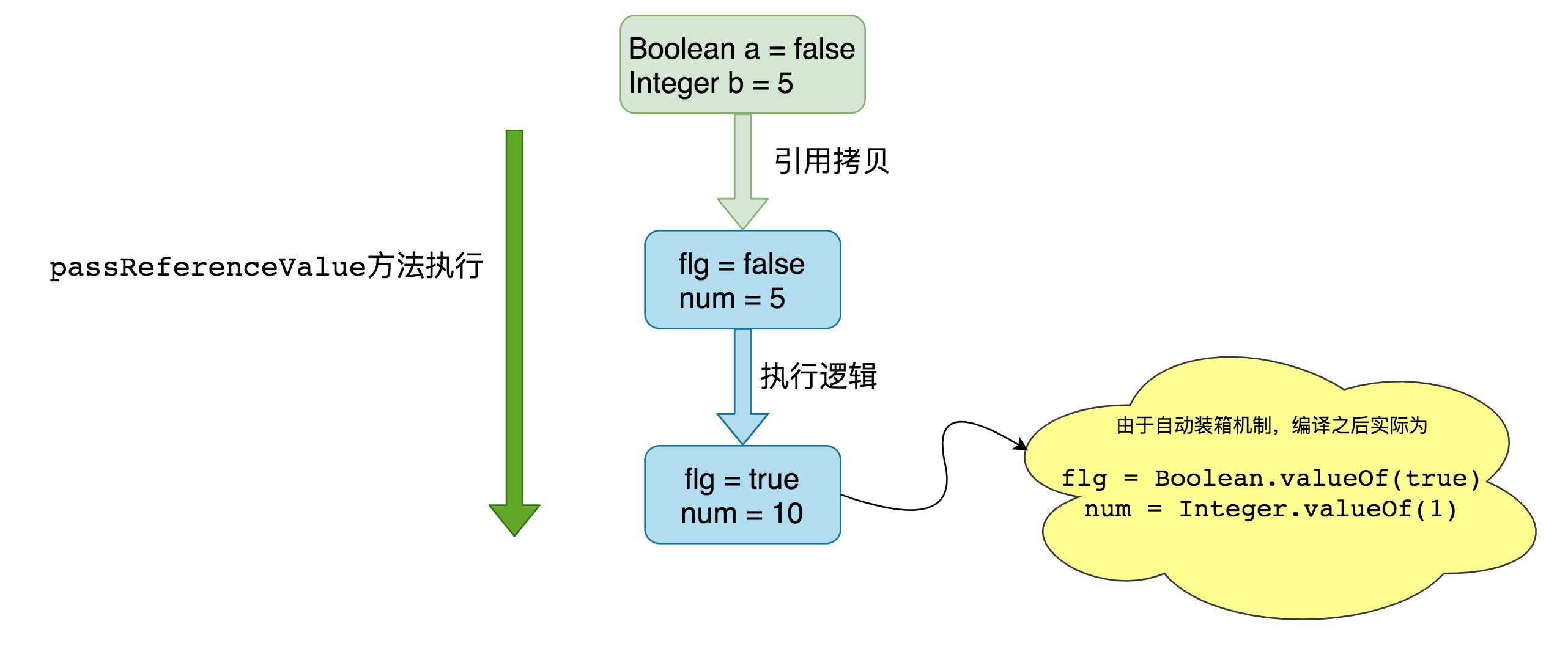 这是因为Java中的自动装箱机制,当在方法中执行 flg = true 时,实际在编译后执行的是 flg = Boolean.valueOf(true),即又会产生一个新的Boolean对象。同理Integer num也是如此。