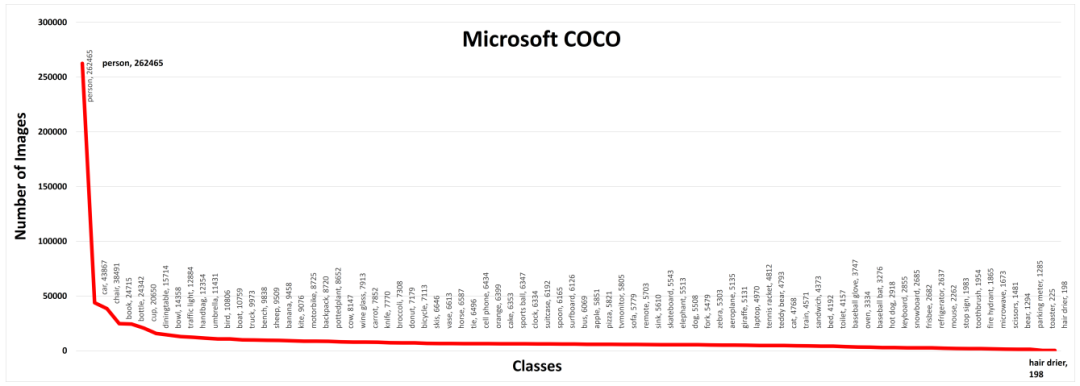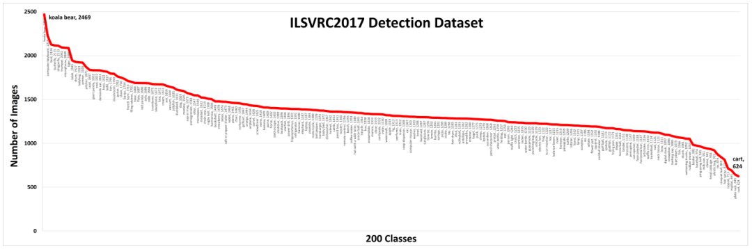 ImageNet Large Scale Visual Recognition Challenge(ILSVRC)是一项从2010年到2017年每年举办的挑战赛,并成为了评估算法性能的基准数据集。数据集大小超过100万张图像,其中包括1000个目标类别。其中200个类别被手选用于目标检测任务,包括超过500k张图像。包括ImageNet和Flikr在内的各种来源被用于构建检测数据集。此外,ILSVRC还通过放宽IoU阈值来更新评估指标,以用于评估小目标检测性能。上图描绘了在ImageNet数据集中各类图像的数量分布。