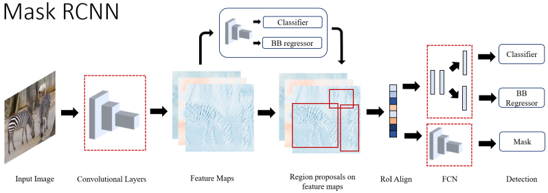 Mask R-CNN 是一种扩展了 Faster R-CNN 的双阶段目标检测算法,它在 Faster R-CNN 的基础上增加了一个并行分支,其用于像素级目标实例分割。该分支是一个在 RoI 上应用的全连接层,用于将每个像素分类以完成扩展的分割任务。它使用类似于 Faster R-CNN 的基本架构进行目标区域建议,并增加了一个Mask Head并行于分类 Head 和回归 Head。Mask R-CNN与 Faster R-CNN最主要区别是前者使用 RoIAlign 层,而不是 RoIPool 层,这可以避免由于空间量化而导致的像素不对齐问题。作者选择 ResNeXt-101 作为其主干网络,并使用特征金字塔网络(FPN)来提高准确率。此外,Mask R-CNN 的总体训练过程类似于 Faster R-CNN。