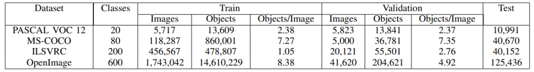 谷歌的Open Images数据集由9.2 m张图像组成,其中包括图像级标签、目标边界框和分割掩模等标注。它于2017年推出,并已经历了六次更新。对于目标检测,Open Images有16 m个边界框,针对1.9 m张图像的600个类别,这使它成为最大的目标定位数据集。它的创建者特别注意选择有趣、复杂和多样的图像,每张图像平均有8.3个目标类别。在Pascal VOC中引入的AP做了几点改变,比如忽略未标注的类别、类别及其子类别的检测要求等。上图描绘了在Open Images数据集中各类图像的数量分布。