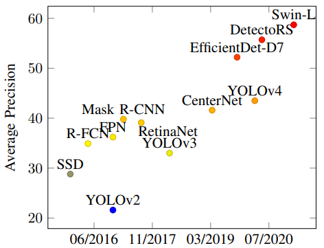 早期的目标检测模型是由手工提取的特征提取器构建的,例如 Viola-Jones 检测器和方向梯度直方图(HOG)等。这些模型运行速度慢且检测不准确,在未熟悉的数据集上表现不佳。卷积神经网络(CNN)和深度学习在图像分类任务中的再次出现改变了视觉感知的景观。AlexNet 在 2012 年 ImageNet 大规模视觉识别挑战赛(ILSVRC)中以绝对优势获得了冠军,这极大地启发科研人员/从业者对基于深度学习的计算机视觉算法进行深入研究。今天,目标检测在自动驾驶汽车、身份检测、安防和医疗领域都有大量的应用。近年来,随着新工具和技术的快速发展,目标检测算法的性能取得了指数级增长。