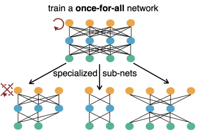 神经网络架构搜索算法(NAS)在过去几年中构建了许多轻量级SOTA模型。然而,由于抽样模型训练策略,它们的计算成本非常高。Cai等人提出了一种将模型训练阶段与神经网络架构搜索阶段解耦的方法。模型只被训练一次,并且可以根据需要从中蒸馏出子网络。Once-For-All(OFA)网络在卷积神经网络的四个重要维度中为这样的子网络提供了灵活性,其中包括:深度、宽度、内核大小和维度。由于它们嵌套在OFA网络内并且与训练相冲突,因此它可以在训练过程中逐步缩小参数尺寸,从而减少计算量并提高精度。首先,使用最大的参数尺寸训练最大的网络。然后,通过逐渐减小内核大小、深度和宽度来微调网络。对于弹性内核,使用大内核的中心作为小内核。由于中心是共享的,所以使用内核变换矩阵来保持性能。为了改变深度,使用前几层,而跳过大网络的其余部分。弹性宽度采用通道排序操作来重新组织通道,并在较小的模型中使用最重要的通道。OFA在ImageNet top-1精度百分比方面取得了最先进的80%,并获得了第4届低功耗计算机视觉挑战(LPCVC)的冠军,同时在搜索时间上减少了许多数量级。它展示了一种为各种硬件需求设计轻量级模型的新范式。