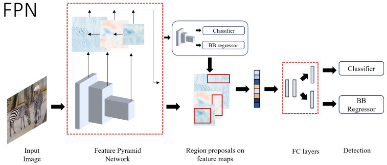 使用图像金字塔提取多尺度图象信息是增强小物体检测的常用方法。虽然这种方法会增加检测算法的平均精度,但同时推理时间也是极大地增加。Lin 等人提出了特征金字塔网络 (FPN),它具有自上而下与横向连接的架构,这可以在不同尺度上建立高级语义特征。 具体地,FPN 具有两条通路,一条自下而上的通路是在对多个尺度特征图编码的 ConvNet,另一条自上而下的通路将来自更高级的粗糙特征映射升采样为高分辨率特征。这两条通路由横向连接相连,通过 1x1 卷积操作来增强特征中的语义信息。如上图所示,FPN 被用作于将主干网络的多尺度特征融合交互后再输入至RPN。