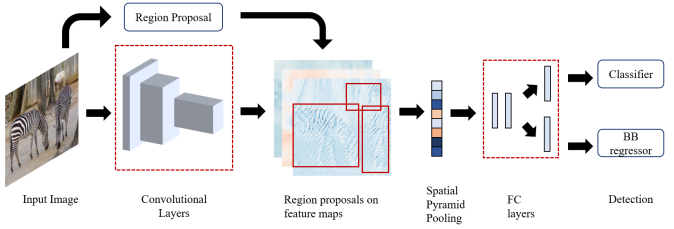 He 等人提出了使用空间金字塔池化(SPP)层来处理任意大小或宽高比的图像。SPP-net 仅在候选区域生成算法之前的卷积层后添加了一个池化层,从而使网络能不再受限于固定尺寸的输入图象,并这一操作能减少大量的计算量。选择性搜索算法用于生成候选窗口。首先通过 ZF-5 网络的卷积层将输入图像映射到特征图,然后将候选窗口映射到特征图上,再将其通过金字塔池化层的空间 bins 转换为固定长度的表示,最后该向量通过全连接层并最终传递给 SVM 分类器以预测类别和分数。与 R-CNN 类似,SPP-net 也使用特定的后处理层来优化目标的定位结果,同时它也使用相同的多阶段训练过程,但仅需要在全连接层上进行微调。