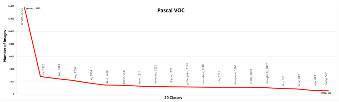 Pascal Visual Object Classes(VOC)是目标检测领域常用的数据集。它于2005年开始,在四种目标类别上进行分类和检测任务,但两个版本的挑战通常被用作基准。VOC07数据集有5k张训练图片和超过12k张标注图片,而VOC12数据集将其增加到11k张训练图像和超过27k张标注图片。目标类别被扩展到20类,并且像分割和动作检测这样的任务也被包括在内。Pascal VOC引入了平均精度(mAP)并以IoU@50(交集除以并集)的标准来评估模型的性能。上图描绘了在Pascal VOC数据集中各类图像的数量分布。