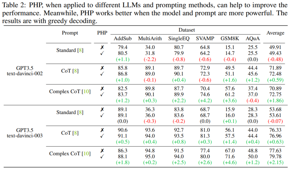 本文介绍了 PHP 与 LLMs 交互的新方法,具有多个优点:1)PHP 在数学推理任务上实现了显著的性能提升,在多个推理基准测试上领先于最先进的结果;2)使用更强大的模型和提示,PHP 可以更好地使 LLMs 受益;3)PHP 可以与 CoT 和 SC 轻松结合,进一步提高性能。