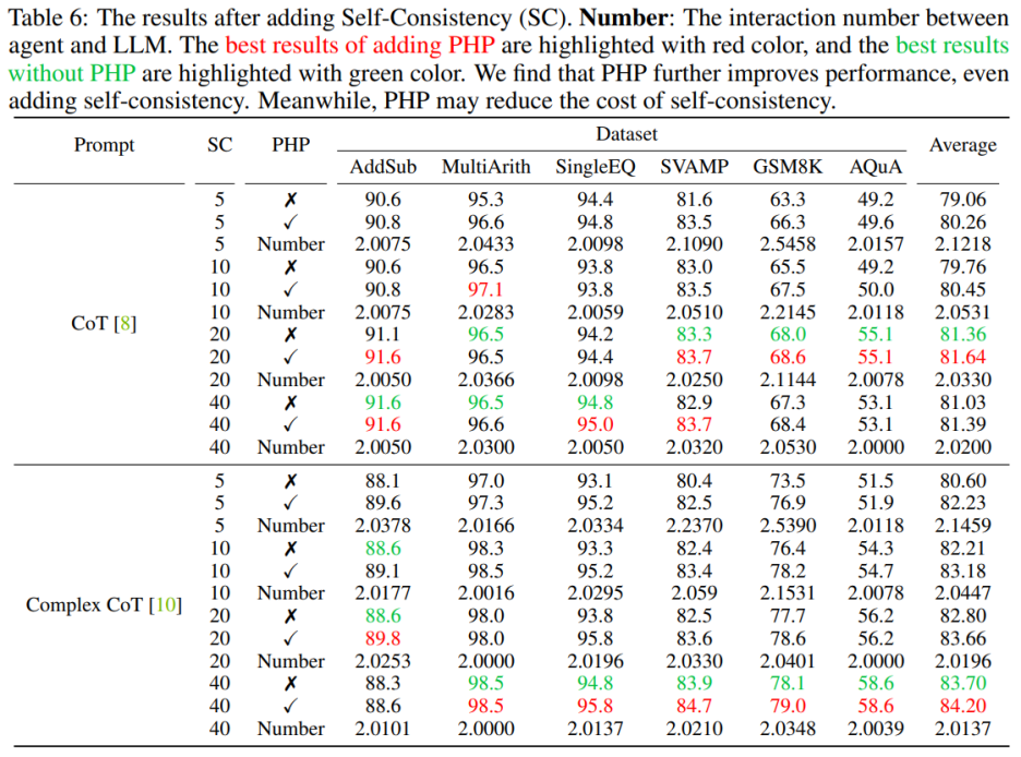使用 PHP 可以降低 SC 的成本,众所周知,SC 涉及更多的推理路径,导致成本更高。表 6 说明,PHP 可以是降低成本的有效方法,同时仍保持性能增益。如图 3 所示,使用 SC+Complex CoT,可以使用 40 个样本路径达到 78.1% 的准确率,而加入 PHP 将所需平均推理路径降低到 10×2.1531=21.531 条路径,并且结果更好,准确率达到了 78.2%。
