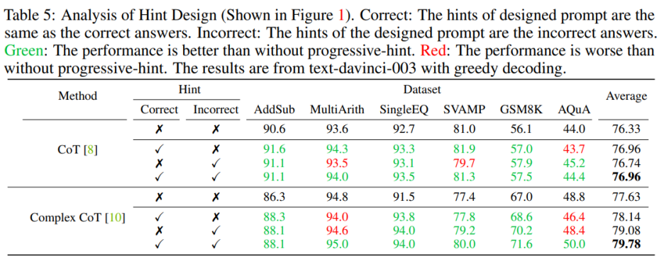 在设计提示时需要同时包含正确和错误的提示。当设计的提示同时包含正确和错误的提示时,使用 PHP 的效果优于不使用 PHP。具体来说,提示中提供正确的提示会促进生成与给定提示相符的答案。相反,提示中提供错误的提示则会通过给定的提示鼓励生成其他答案