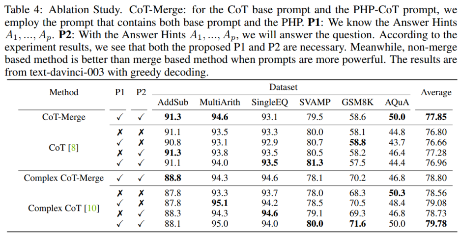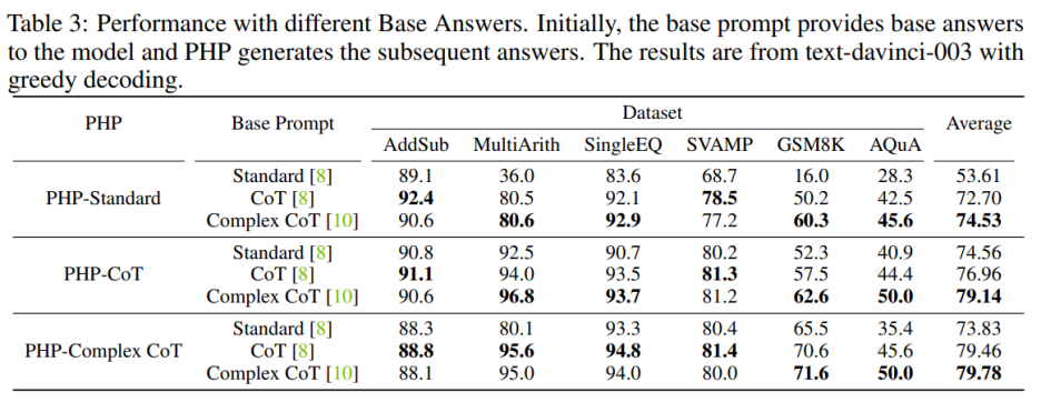 如果 PHP 不是基于相应的 Base Prompt 进行设计,那么效果可能进一步提高。使用 Base Prompt Complex CoT 的 PHP-CoT 在六个数据集中的四个数据集表现优于使用 CoT 的 PHP-CoT。同样地,使用基础提示 CoT 的 PHP-Complex CoT 在六个数据集中的四个数据集表现优于使用 Base Prompt Complex CoT 的 PHP-Complex CoT。作者推推测这是因为两方面的原因:1)在所有六个数据集上,CoT 和 Complex CoT 的性能相似;2)由于 Base Answer 是由 CoT(或 Complex CoT)提供的,而后续答案是基于 PHP-Complex CoT(或 PHP-CoT),这就相当于有两个人合作解决问题。因此,在这种情况下,系统的性能可能进一步提高。