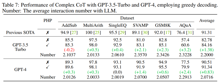 作者按照以前的工作设置,使用文本生成模型进行实验。随着 GPT-3.5-Turbo 和 GPT-4 的 API 发布,作者在相同的六个数据集上验证了具有 PHP 的 Complex CoT 的性能。作者对这两个模型都使用贪心解码(即温度 = 0)和 Complex CoT 作为提示。
