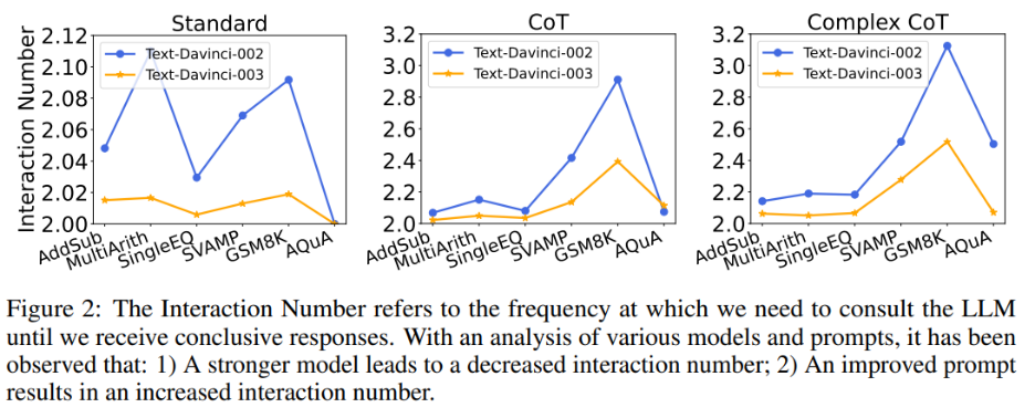 2)当使用相同的模型时,随着提示变得更强大,交互次数通常会增加。这是因为当提示变得更有效时,LLMs 的推理能力会得到更好的发挥,从而使它们能够利用提示跳出错误答案,最终导致需要更高的交互次数才能达到最终答案,这使得交互次数增加。