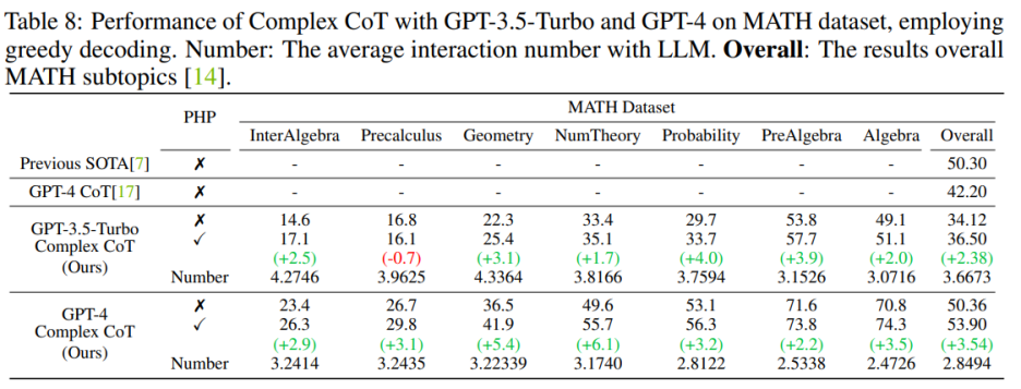 在部署 GPT-4 模型后,作者能够在 SVAMP、GSM8K、AQuA 和 MATH 基准测试上实现新的 SOTA 性能。作者提出的 PHP 方法不断改善了 GPT-4 的性能。此外,与 GPT-3.5-Turbo 模型相比,作者观察到 GPT-4 所需的交互次数减少了,这与 “当模型更加强大时,交互次数会减少” 的发现相一致。