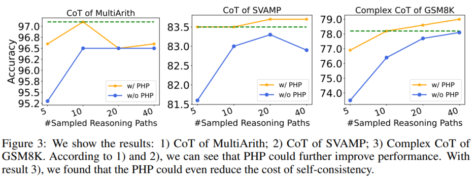 使用 PHP 可以进一步提高性能。通过使用类似的提示和样本路径数量,作者发现在表 6 和图 3 中,作者提出的 PHP-CoT 和 PHP-Complex CoT 总是比 CoT 和 Complex CoT 表现更好。例如,CoT+SC 的样本路径为 10、20 和 40 时,能够在 MultiArith 数据集上达到 96.5% 的准确率。因此,可以得出结论,CoT+SC 的最佳性能为 96.5%,使用 text-davinci-003。然而,在实施 PHP 之后,性能升至 97.1%。同样,作者还观察到在 SVAMP 数据集上,CoT+SC 的最佳准确率为 83.3%,在实施 PHP 后进一步提高到 83.7%。这表明,PHP 可以打破性能瓶颈并进一步提高性能。