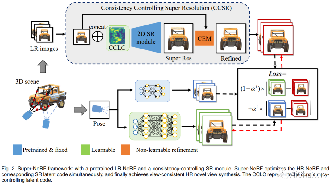 神经辐射场 (NeRF) 在 3D 场景建模和合成高保真新颖视图方面取得了显著成功。然而,现有的基于 NeRF 的方法更侧重于充分利用图像分辨率来生成新颖的视图,而较少考虑在有限的输入分辨率下生成细节。类似于图像超分辨率的广泛使用,NeRF 超分辨率是生成 3D 场景的高分辨率隐式表示的有效方法,具有巨大的潜在应用。到目前为止,这样一个重要的课题仍未得到充分探索。在本文中,我们提出了一种名为 Super-NeRF 的 NeRF 超分辨率方法,仅从低分辨率输入生成高分辨率 NeRF。给定多视图低分辨率图像,Super-NeRF 构建了一个一致性控制超分辨率模块,为 NeRF 生成视图一致的高分辨率细节。具体来说,为每个低分辨率输入图像引入可优化的潜在代码,以控制 2D 超分辨率图像收敛到视图一致的输出。每个低分辨率图像的潜在代码都与目标 Super-NeRF 表示协同优化,以充分利用 NeRF 构造中固有的视图一致性约束。我们验证了 Super-NeRF 在合成、真实世界和 AI 生成的 NeRF 数据集上的有效性。Super-NeRF 在高分辨率细节生成和跨视图一致性方面实现了最先进的 NeRF 超分辨率性能。