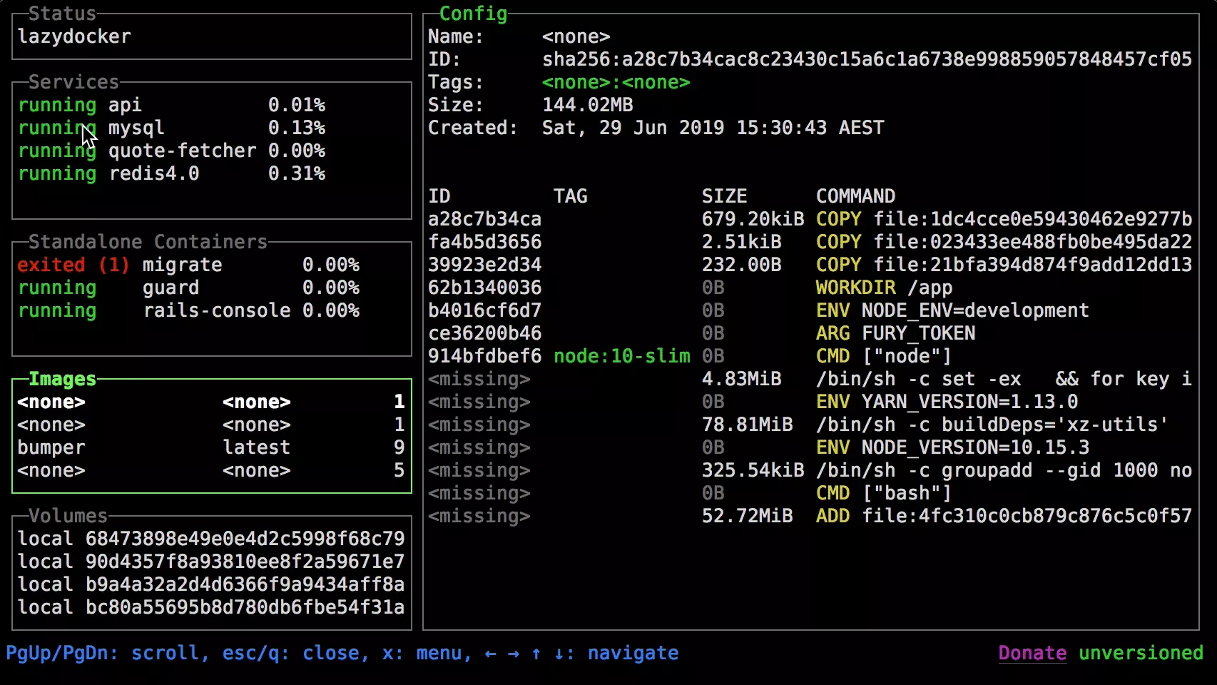LazyDocker是基于终端的一个可视化查询工具,支持键盘操作和鼠标点击。相比Portainer来说可能不那么专业,不过对于开发者来说可能反而更加好用了。因为一般开发者都是使用命令行来运行Docker,偶尔需要图形化查看的时候,就可以使用LazyDocker这个工具。