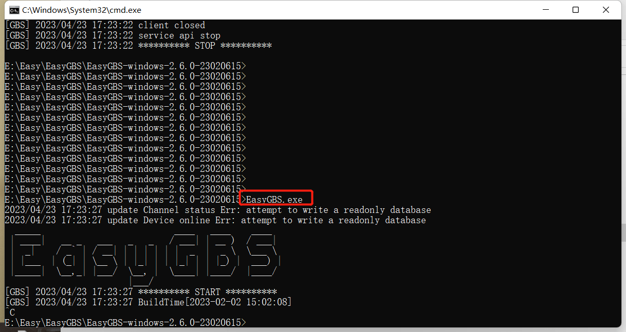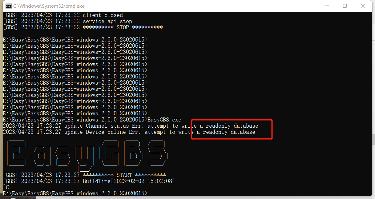 3)通过EasyGBS.exe打印可以看到,有一条关于数据库的打印:“attempt to write a readyonly database";