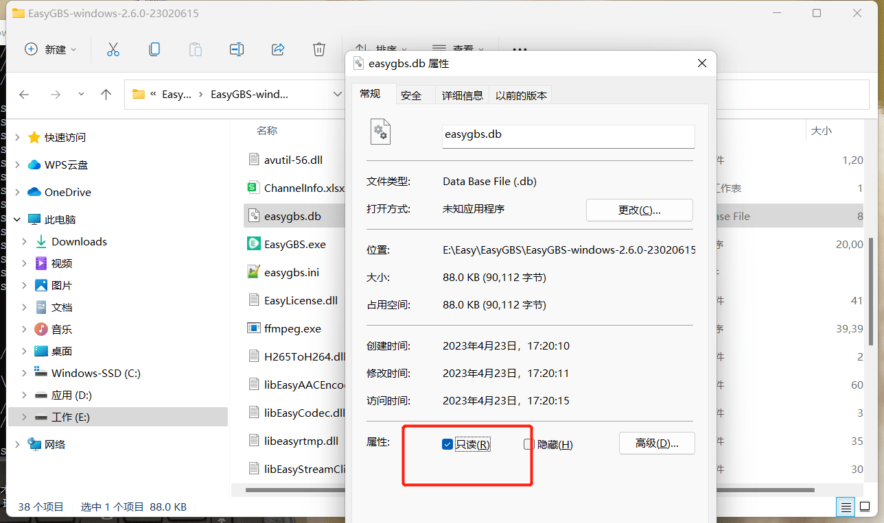 5)通过属性可以看到,数据库被设置为了只读。取消只读,然后再次启动EasyGBS,查看是否可以正常启动;