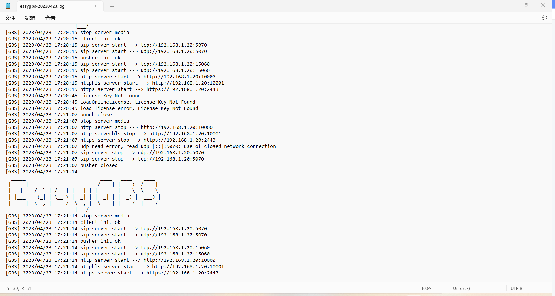 1)查看EasyGBS的日志,日志正常,没有打印有用信息;