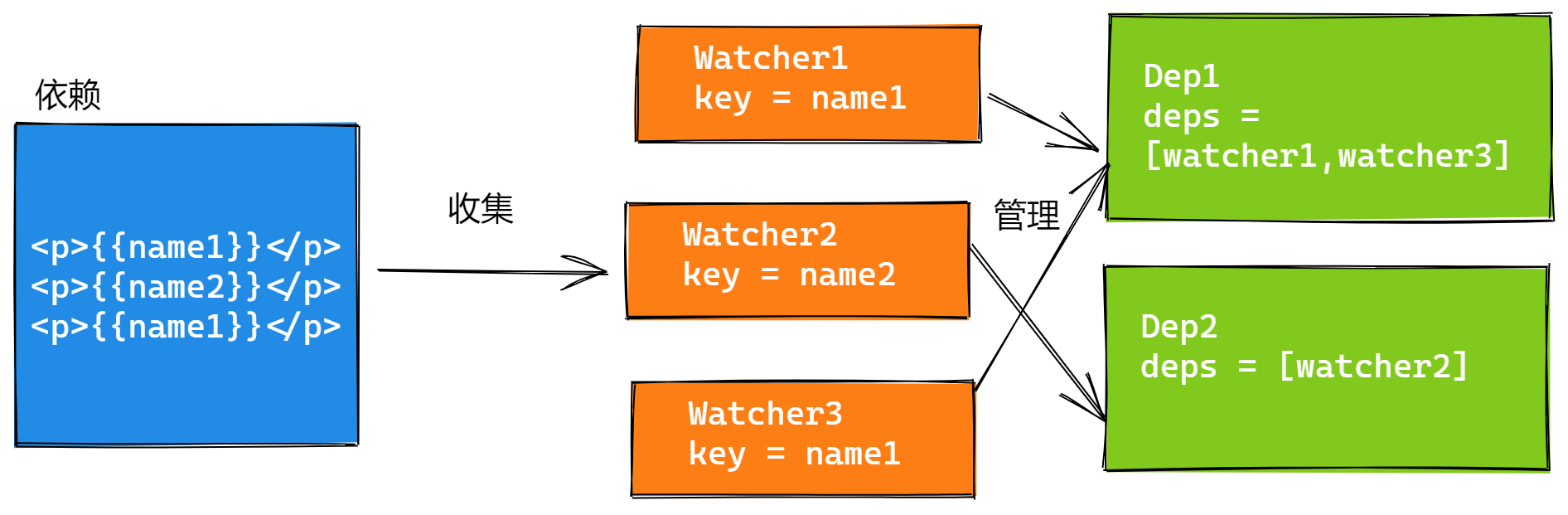 视图中会用到 data 中某 key,叫依赖。同一个 key 可能出现多次,每次都需要收集出来用一个 watcher 来维护它,这个过程为依赖收集。多个 watcher 需要一个 Dep 来管理,需要更新时由 Dep 统一通知。
