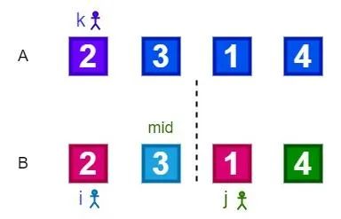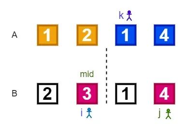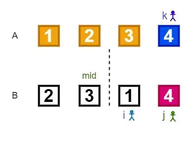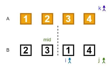以数组A{2, 3, 1, 4}为例,首先拷贝一份A存于B,由于B的左右索引分别为l=0和r=3,所以其mid = (l+r)/2 ,由于l和r均为int类型,因此mid=1;根据归并排序算法中的分解方法,我们将{2, 3}(对应B中[l, mid]这段区间)和{1, 4}(对应B中[mid+1, r]这段区间)作为A的拆分出来的两个子数组(且他们已经有序了,可以直接进行排序归并了)。使用索引i和j分别指向这两个子数组的第一个元素,索引k指向原数组A的第一个元素。