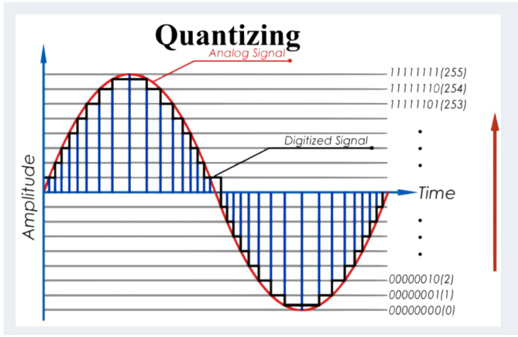 量化: 量化就是通过四舍五入的方法将采样后的模拟信号转换成一种数字信号的过程。