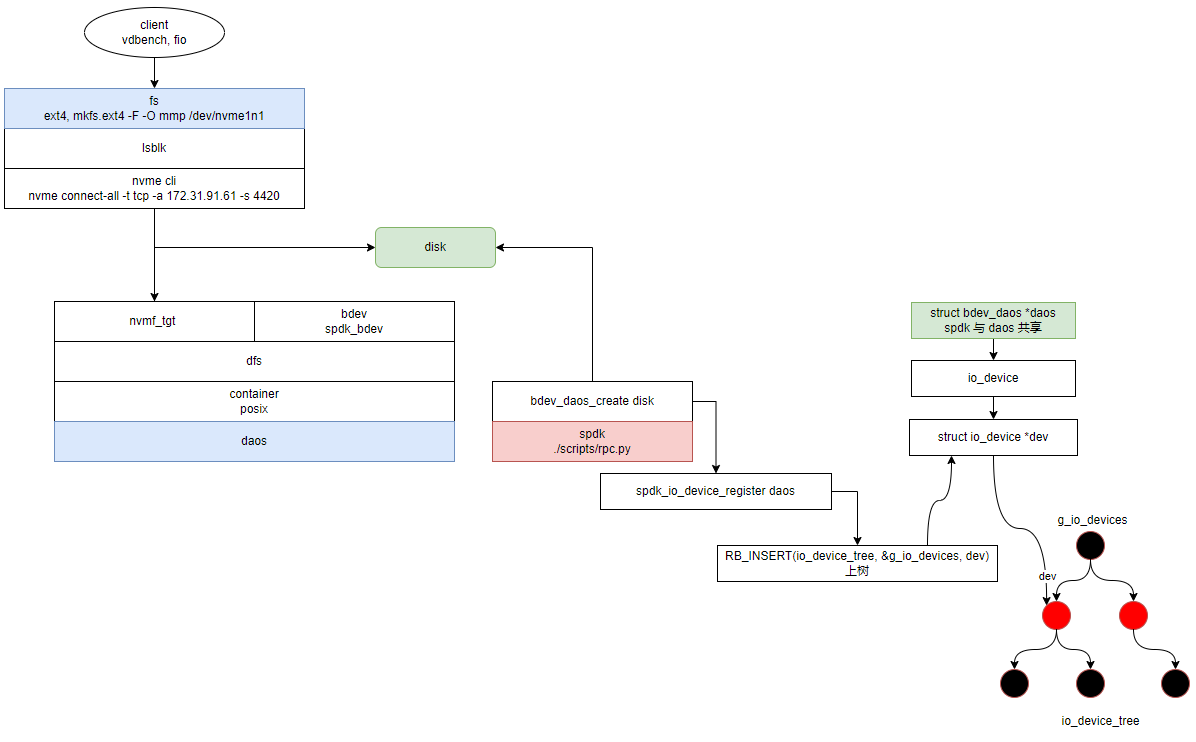 bdev_get_daos_engine 初始化daos引擎bdev_daos_io_channel_create_cb 用创建通道的方式检测容器连通性, 如果在通道创建过程中,由于参数不正确而发生错误,例如: 池/容器名称错误,或其他一些内部 DAOS 错误(如达到 CART 上下文限制),bdev_daos_io_channel_create_cb() 会发出有关此类错误的信号,但是,spdk_io_device_register() 不会将它们考虑在内。 设备创建成功,返回成功的 RPC 响应并将 bdev 留在 bdev 列表中,但它完全无法使用且不可修改, 尝试在创建通道的时候连接到DAOS容器,所以在这里模拟创建一个通道,这样我们就可以在创建DAOS bdev的时候返回一个失败,而不是等到第一个通道创建的时候才发现,留下不可用的bdev注册spdk_io_device_register 将不透明的 io_device 上下文注册为 I/O 设备。 I/O设备注册后,可以使用spdk_get_io_channel()函数返回I/O通道spdk_bdev_register 注册一个新的 bdev。 必须从 SPDK APP线程调用此函数大致流程