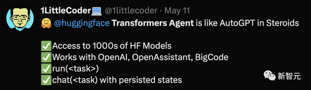 还有人表示,Transformers Agent打开了自然语言编程的大门,可以想象,未来的操作系统就是智能模型,人类通过自然语言编排任务,越来越多的非开发者可以自己实现各种计算机应用。