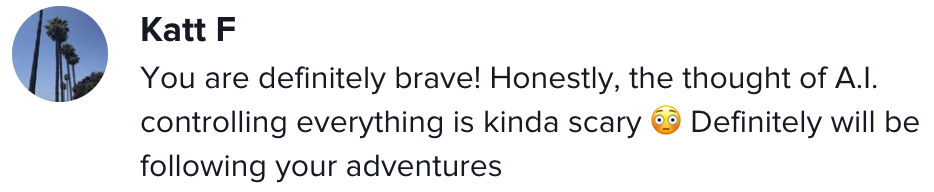 有网友表示,你真的很勇敢!说实话,一想到AI控制一切就有点害怕。