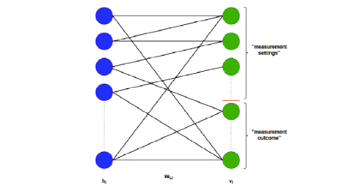 该架构由两层神经元组成。一个是可见层(绿色),一个是隐藏层(蓝色)。