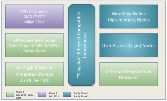 Perlmutter 基于包括 Slingshot 互连的 HPE Cray Shasta 平台,这是一个具有 GPU 加速节点和仅 CPU 节点的异构系统。该系统分两个阶段进行安装——最近揭幕的是第一阶段,其中包括系统的 GPU 加速节点和暂存文件系统;第 2 阶段将在 2021 年晚些时候添加仅使用 CPU 的节点。