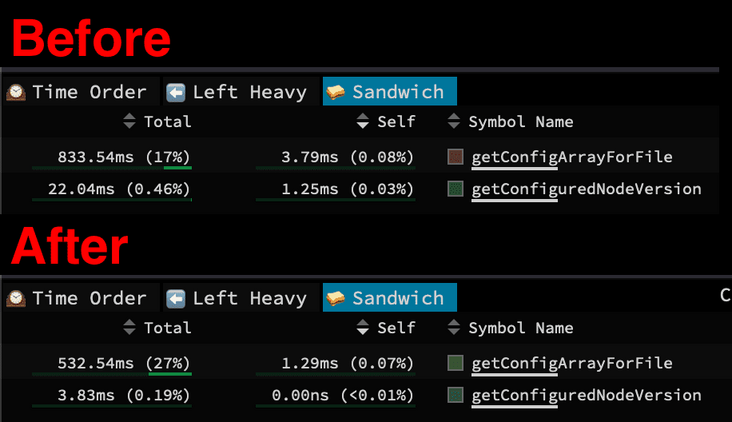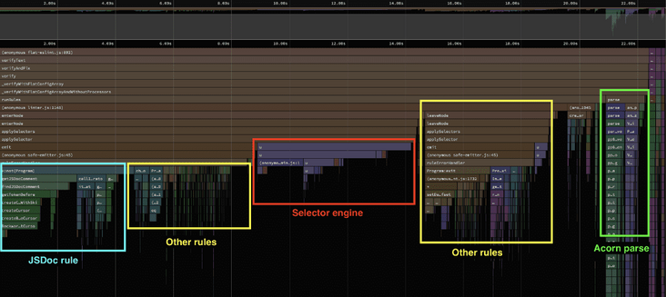与之前类似,我们可以在性能剖析图中看到各个区域显示出耗时的情况。有一个区域暗示了将TypeScript的格式转换为eslint所理解的格式需要消耗相当多的时间。配置加载方面也出现了一些奇怪的情况,因为它实际上不应该占用这么多时间。我们还发现了一个老朋友,即eslint-import-plugin