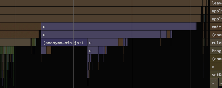 虽然减少50%听起来不错,但仍然没有解决这个代码被调用2000万次的问题。对我来说,这才是真正的问题。我们更多地是试图减少这里的症状影响,而不是解决潜在的问题。我们已经在文件中进行了迭代,因此我们应该知道自己在哪里。不过,更改这一点需要进行更深入的重构,这对于本博客文章来说太多了。鉴于这不是一个容易的修复,我检查了一下在性能分析中还有哪些值得关注的地方。中心的长紫色条很难忽视,不仅因为它们是不同的颜色,而且因为它们占用了很多时间,并且没有深入到数百个较小的函数调用中。