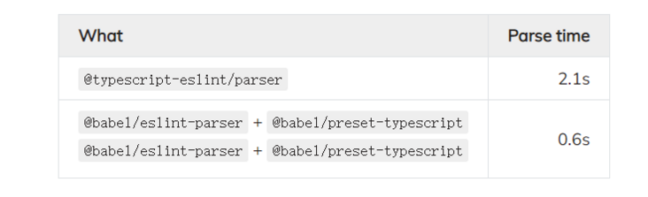 请注意,尽管在撰写本文时,Babel解析器明显更快,但它不支持类型感知的代码检查。这是 @typescript-eslint/parser