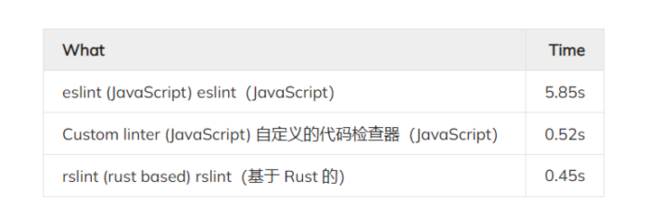 还有一些关于 Rust 端口的闲聊,这引起了我的好奇心,想知道目前基于 Rust 的 JavaScript 语言检查器有多快。唯一一个似乎有些生产就绪并能够解析 TypeScript 语法大部分内容的是 rslint。