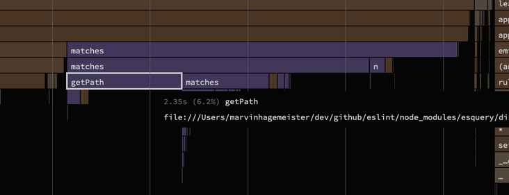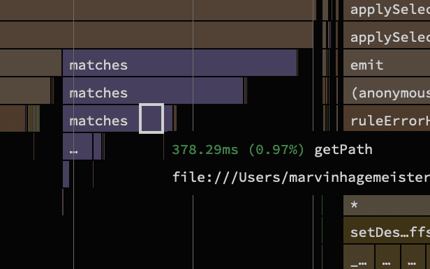 函数,我们看到由奇怪的 for-of 下传递创建的大量开销,类似于我们之前看到的情况。为了节省时间,我直接在 Github 上复制了源代码中的函数。由于 matches()