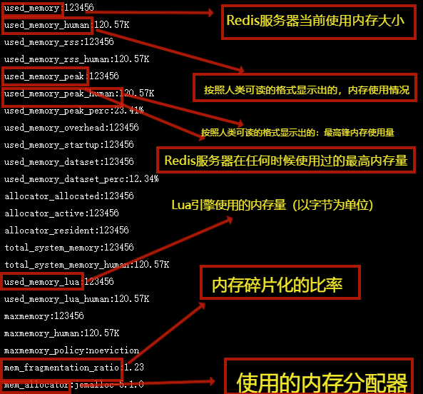 INFO memory该命令会返回Redis服务器的内存使用情况的详细信息,如图所示:
