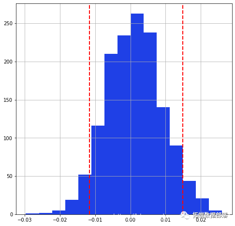 print(percentile( returns,5),percentile( returns,95)) VaR - 在5%的概率下,最小损失为5.7%,同样,在5%的概率下,收益可以高于15%