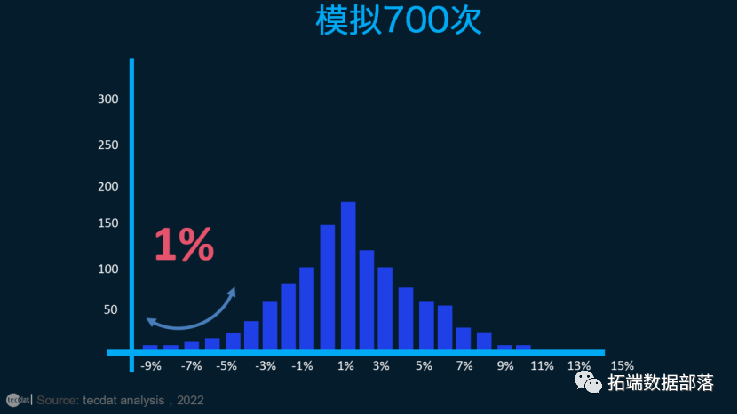 总而言之,我们对月收益进行了 700 次假设试验。其中,5个结果在-5%和-7%之间;2个在 -7% 和 -9% 之间。这意味着最差的7个结果(即最差的 1%)低于 -5%。因此,蒙特卡罗模拟得出以下 VaR 类型的结论:在 99% 的置信度下,我们预计在任何给定月份的损失不会超过 5%。