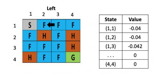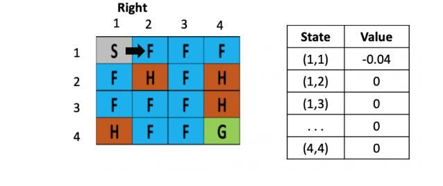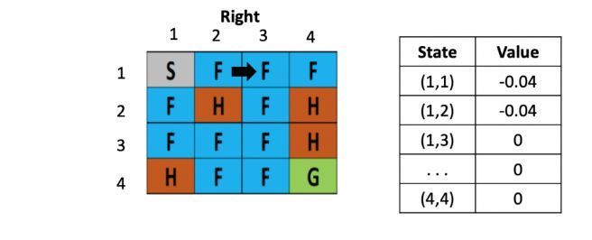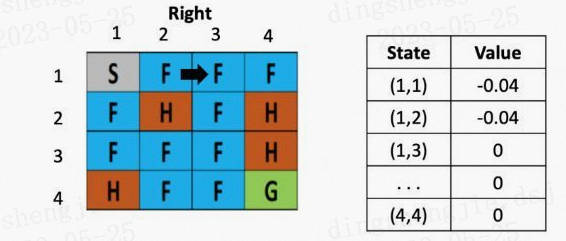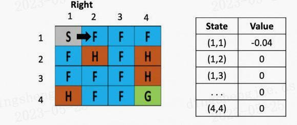 左图是每个位置对应的Q value的表,最初都是0,一开始的策略就是随机生成的,假定第一步是向右,那根据上文公式,假定学习率是$\alpha$是 0.1,折现率$\gamma$是0.5,而每走一步,会带来-0.4的奖励,那么(1.2)的Q value就是 0 + 0.1 × -0.4 + 0.5× (0)-0 = -0.04,为了简化问题,此处这里没有假设湖面有风。
